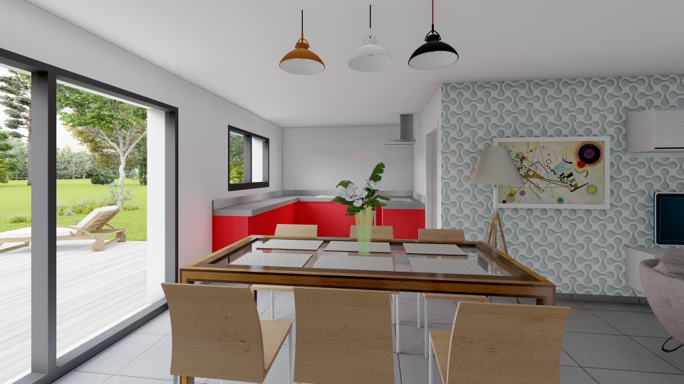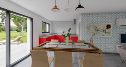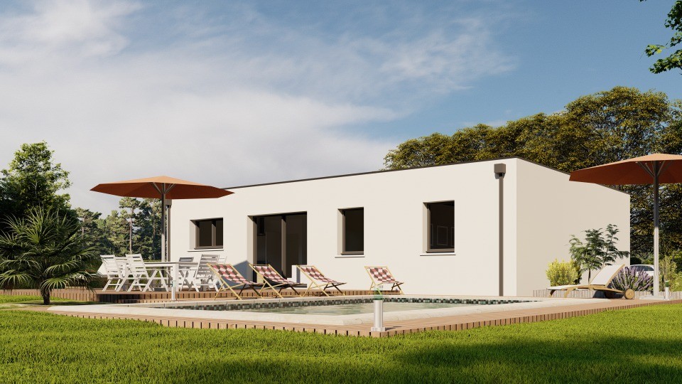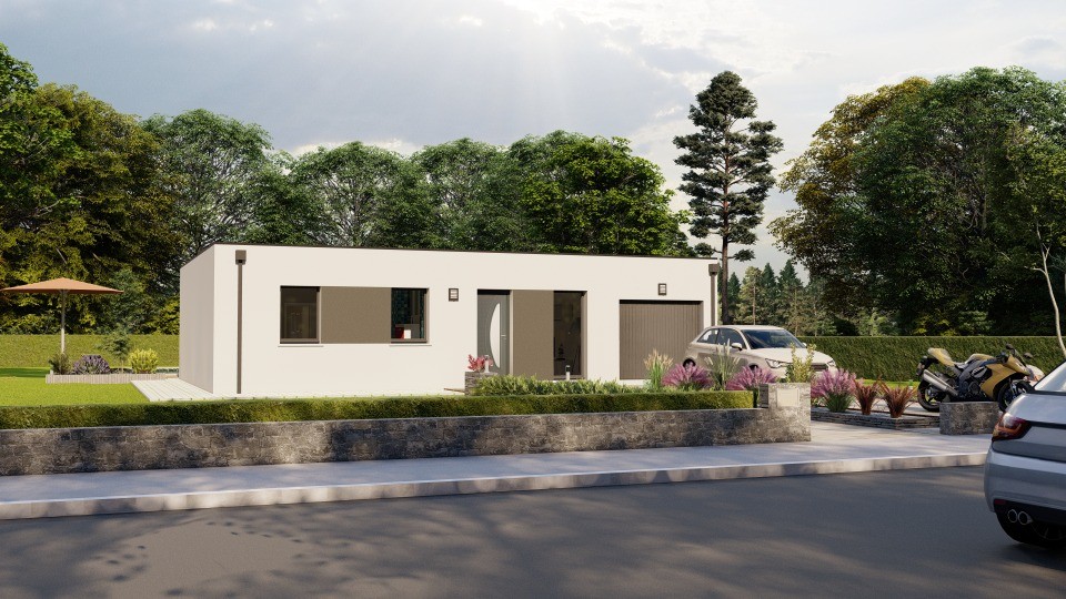 La toiture plate permet une esthétique épurée et offre des possibilités d'aménagement supplémentaires comme une terrasse ou des panneaux solaires. Le garage intégré assure confort et fonctionnalité. Conforme à la RE2020, ce modèle garantit une faible consommation énergétique.