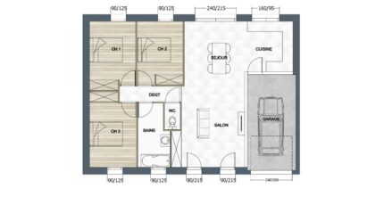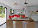 L'agencement intérieur est identique aux autres modèles Alizé 2 : une grande pièce de vie ouverte, trois chambres, une salle de bain fonctionnelle et des rangements bien pensés. Ce modèle est parfait pour ceux qui recherchent une maison familiale au charme classique, avec tout le confort moderne.